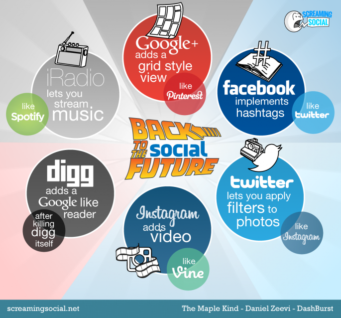 Kijk alleen maar hoe de onderdelen van verschillende socialmediasites op elkaar zijn gaan lijken in de loop van de jaren, ze apen elkaar allemaal na. Net als die klei waar je vroeger mee speelde: toen je het van Sinterklaas kreeg, waren het verschillende felle kleuren, maar na een aantal keer spelen, had je alleen nog maar grijze massa. Zelfs Dagobert Duck twitterde onlangs dat je anders naar concurrenten moet kijken: