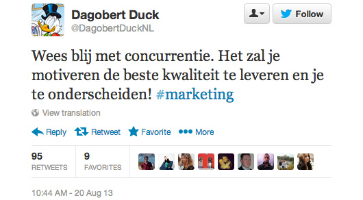 Oftewel: Negeer je concurrenten en zoek uit wie je klanten zijn en wat jouw product voor hen doet. En probeer vanuit die behoefte te innoveren. Je zult het merken: zodra je je focus verschuift van concurrenten naar klanten en die al je aandacht geeft, wordt concurrentie irrelevant. “Don’t focus on the competition, they’ll never give you money”, weer zo’n super-oneliner van Jeff Bezos. En Jeff kan het weten, hij heeft goed geluisterd naar de rijkste eend van Duckstad. Een eend voor wie concurrentie blijkbaar géén obsessie is.