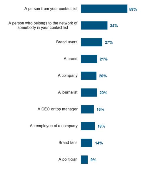 Wat mij opviel, is de heel lage score van brand fans. Enkel politici scoren nog lager. Informatie afkomstig van medewerkers van een bedrijf of zelfs de CEO van het bedrijf is betrouwbaarder dan de info van een fan. Opmerkelijk, niet? De feedback en conversaties van een 'gewone' klant zijn dus invloedrijker dan de feedback van een fan.