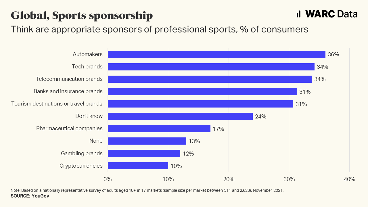 Meer dan een derde van de consumenten zei dat autofabrikanten (36%) geschikte sportsponsors zijn, met tech (34%) en telecommunicatie (34%) merken op de voet. Als succesvolle voorbeelden worden door hen onder meer het automerk ŠKODA, het technologiemerk Samsung en het telecommerk Vodafone genoemd. Banken en verzekeringsmerken (31%) en toeristische bestemmingen of reismerken (31%) worden ook als passend beschouwd. Farmaceutische bedrijven scoren aanzienlijk lager (17%). Sportsponsoring is aantrekkelijk voor veel adverteerders, zo stellen de onderzoekers, omdat het de mogelijkheid biedt om een groot en betrokken publiek te bereiken. Onder meer WARC schrijft over het onderzoek en viste er onderstaand overzicht uit.