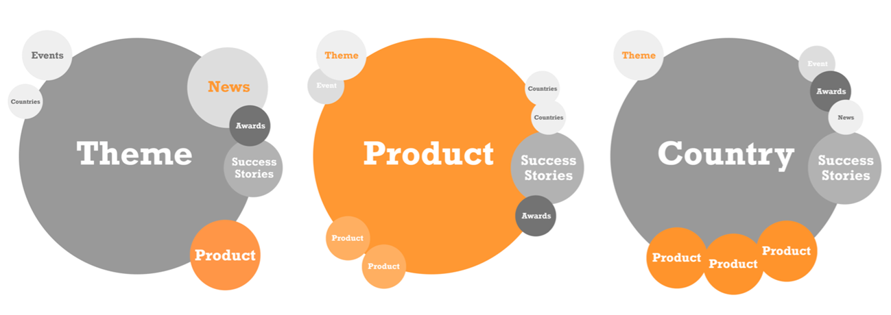 De nieuwe website van ING Commercial Banking heeft drie belangrijke contentgroepen: thema, product en land. Deze groepen zijn allemaal met elkaar verbonden. Zo staat er op een landenpagina welke producten er worden geleverd en welke thematische artikelen logischerwijs met dit land te maken hebben. Een tagging-systeem zorgt ervoor dat alleen relevante content op een pagina wordt getoond (de content staat als het ware in relatie tot elkaar).