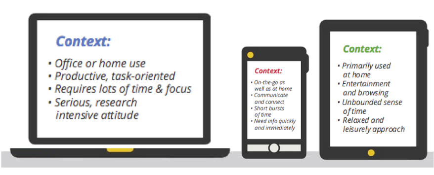 Het Google rapport 'The New Multi-screen World' geeft een interessant beeld van het gebruik van de verschillende devices. De keuze van het device is afhankelijk van de context en het gebruik van devices gaat soms naadloos in elkaar over. De context wordt bepaald door de hoeveelheid tijd die we hebben of nodig hebben, het doel dat we willen bereiken, de locatie en onze gemoedstoestand. Zoals je hieronder kunt zien is de context per device verschillend.