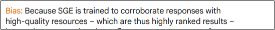 Absoluut waar, maar dan komen we terug bij argument 1, 2 en 3. Deze plekken zullen vergeven worden aan partijen met waardevolle content en E-E-A-T, Google gaat niet informatie van “nobodies” laten zien met het risico dat het niet klopt. Een hint krijgen we in hun whitepaper Google about Search Generative Experience: