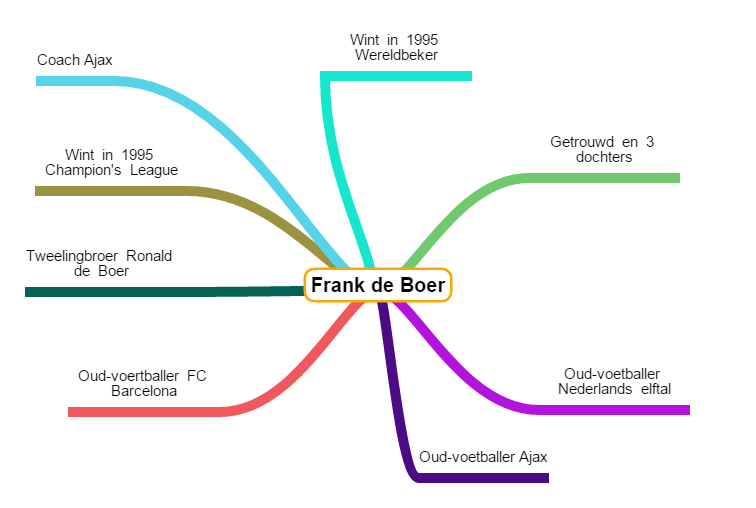 Als voorbeeld zal ik ex-voetballer en coach Frank de Boer nemen. Doordat er over deze persoon veel geschreven is en er waarschijnlijk ook veel naar hem gezocht is via Google, verwacht ik dat de zoekmachine een goed begrip heeft van wie deze persoon is en wat de relaties zijn tussen andere onderwerpen. Google heeft dus waarschijnlijk de kennis die ik zelf in de volgende, sterk versimpele mindmap over Frank de Boer gemaakt heb.