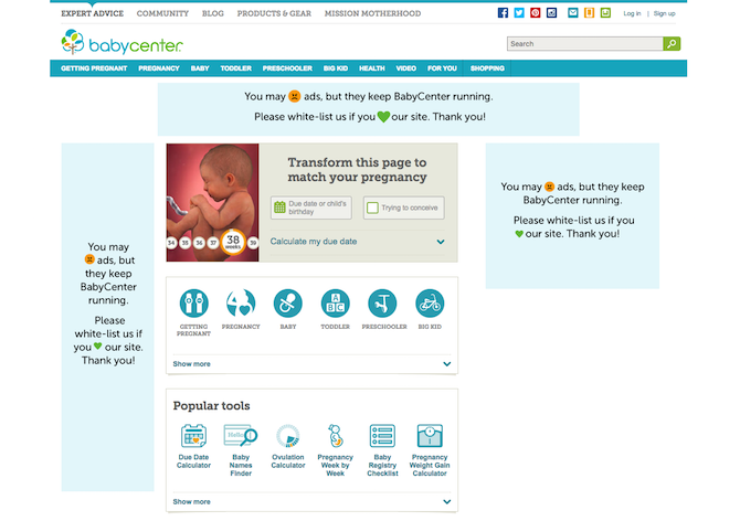 Een bezoek aan J&J Babycenter begint al duidelijk. Je vult als zwangere vrouw in wanneer je bent uitgerekend. Afhankelijk van de fase waar je in je zwangerschap zit, krijg je de voor jou relevante site voorgeschoteld. En de belofte van het platform is duidelijk: publiek opbouwen en relevantie tonen. Natuurlijk zit er in de topnavigatie een knop ‘Products & Gear’ en er is een knop ‘Shopping’.