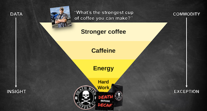 Maar nog was het niet genoeg. Sterke koffie, dat is mooi. Maar waarom wilden zijn klanten dan die sterkere koffie? Omdat er meer cafeïne in zit. Waarom is daar dan zo’n behoefte aan? Omdat je van cafeïne meer energie krijgt. Helder, maar nog niet duidelijk genoeg. Waar is die energie dan voor nodig? Om harder te kunnen werken! Hij bouwde een merk op dat inzicht: Death Wish Coffee. En omdat Mike doorvroeg had hij ook een idee hoe zijn merk eruit zou moeten zien en over welk publiek hij het nu eigenlijk had. Niet te vergelijken met de hipsterlook van de Arabicaboon. En toen was zowel de toon als het beeld van het merk geboren. Erg goed gevonden.