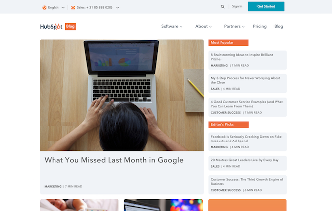 Hubspot: zowel een geroemd als soms verguisd voorbeeld op het gebied van contentmarketing. Zodra je de site openklikt, zie je wel een zeer duidelijk verschil met de voorgaande voorbeelden. Hoewel het duidelijk een contentsite is, zie je ‘Products’, ‘Sign in’, ‘Get Started’, ‘Pricing’ en ‘het telefoonnummer van sales’ veel prominenter in beeld.