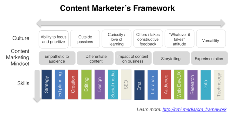 Een goed bruikbare en praktische indeling is het framework van Michele Linn van The Content Marketing Institute. Je kunt het zien als een variant op de bekende T-Shape, maar dan net iets concreter ingevuld. De twee eerste lagen zijn essentiële voorwaarden om succesvol te kunnen zijn in contentmarketing. De laag met skills levert je toegevoegde waarde in je specialisme. Belangrijk bij deze aanpak is de samenhang tussen de diverse skills. Een goede copywriter die geen inzicht heeft in de echte pijnpunten van consumenten of waar een bedrijf zijn geld nu echt mee verdient, zal niet ver komen. Daarom is het ook niet zelden moeilijk om journalisten, die ogenschijnlijk alle skills in huis hebben, succesvol te laten zijn in contentmarketing.