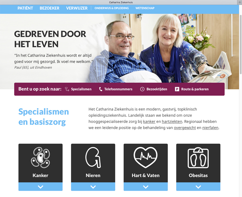 Van den Berk: “Eerst hebben we gekeken naar wie we eigenlijk zijn als Catharina Ziekenhuis. Om goed te bepalen welke thema’s nou het beste aansluiten bij ons DNA. Natuurlijk hebben we dit afgezet tegen de wensen en informatiebehoeften van de verschillende typen zorgconsumenten. Daarin hebben we vervolgens duidelijk keuzes gemaakt.”