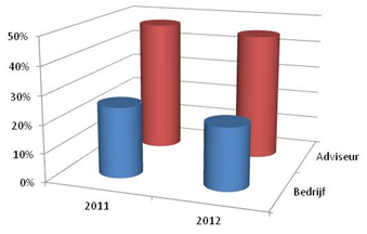 Er is een trend waarneembaar dat de tevredenheid over de conversieratio onder bedrijven en adviseurs iets aan het dalen is. Wat daarbij vooral opvalt, is de discrepantie tussen hoe adviseurs oordelen over de tevredenheid van hun opdrachtgevers en hoe bedrijven daar zelf tegen aankijken. Adviseurs geven in 2012 aan dat 45% van het opdrachtgevers (zeer) tevreden is, daar waar bij de bedrijven zelf niet meer dan 22% (zeer) tevreden zijn.