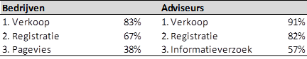 De belangrijkste soorten conversies blijven onveranderd. Net als de voorgaande jaren gaat het vooral om verkoop (83%) en inschrijvingen of registraties (67%). Er is geen enkele andere vorm die in het onderzoek van 2012 een sterke groei heeft doorgemaakt, belangrijker nog, andere vormen als pageviews, informatieverzoeken, downloads en videoviews dalen alleen maar. Het belangrijkste verschil blijkt uit een vergelijking tussen bedrijven en adviseurs. Zoals uit de tabel blijkt, zijn voor bedrijven ‘pageviews’ de belangrijkste conversie na ‘verkoop’ en ‘registratie’ en voor adviseurs zijn dat ‘informatieverzoeken’.