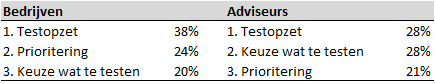 Onder bedrijven is de grootste uitdaging het maken van een goede testopzet en de juiste prioritering. Adviseurs vinden dat naast een goede testopzet de beslissing wat getest moet worden de belangrijkste uitdaging is.