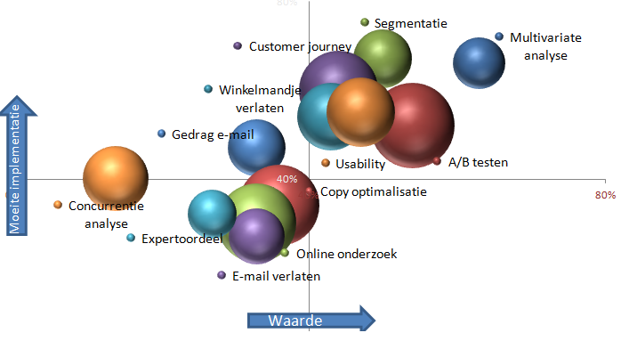 In de grafiek is de waarde die gehecht wordt aan een methode om de conversie te verhogen afgezet tegen de moeite die het kost om het te implementeren. De grootte van de bel laat zien hoe vaak de betreffende methode wordt ingezet. Wat opvalt is dat er geen enkele methode met een hoge waarde eenvoudig te gebruiken is. Daar ligt dus een grote kans.