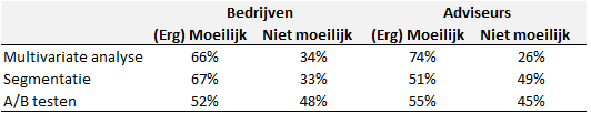 Het onderzoek laat echter ook zien dat zowel bedrijven als adviseurs twee van de drie meest waardevol geachte methoden (erg) moeilijk vinden om daadwerkelijk te implementeren. Meer dan tweederde van de ondervraagden geeft aan MVT als (erg) moeilijk te ervaren en meer dan de helft vindt ‘segmentatie’ (erg) moeilijk.