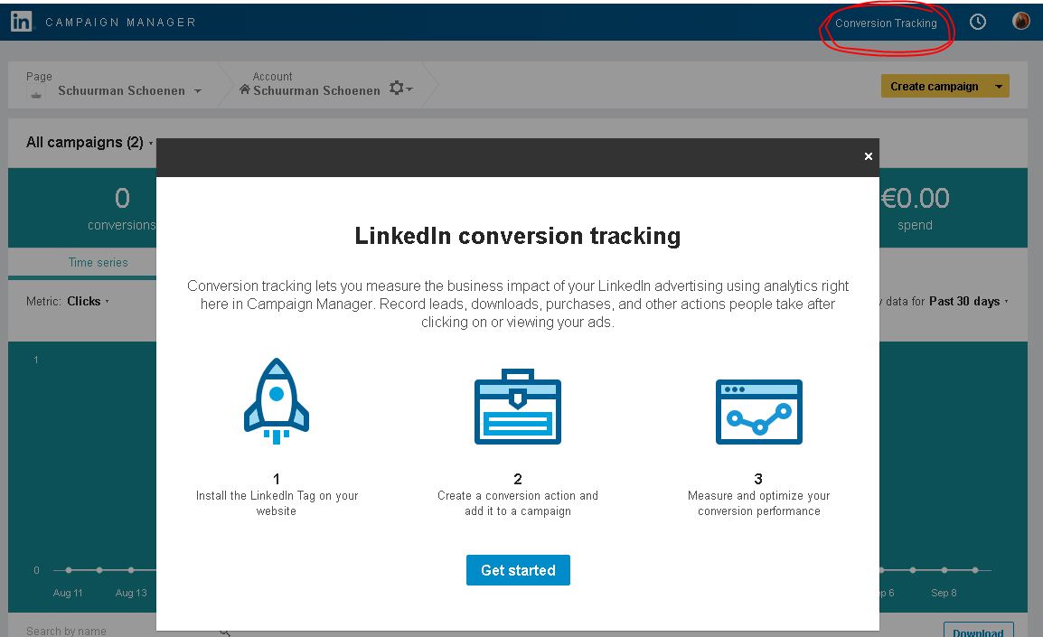 Hoe zet je deze conversiemeting op? Om te beginnen, klik op Conversion Tracking rechts bovenin je Campaign Manager, naast je profielnaam. Het volgende scherm verschijnt; in drie stappen ben je klaar voor Conversion tracking.LinkedIn conversion tracking