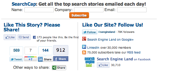 Als laatste ging Joost in op social media en met name blogs. Als je over een product schrijft integreer dan ook een koop knop. Zorg er ook voor dat aan het einde van een blogpost bezoekers kunnen subscriben en het bericht kunnen sharen op wat voor manier dan ook. Hier is een voorbeeld van wat er onder een artikel staat bij Search Engine Land.