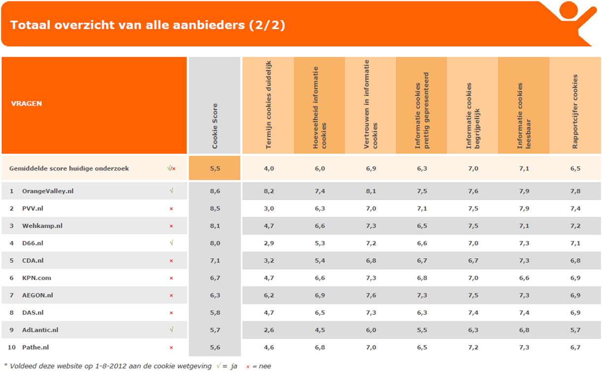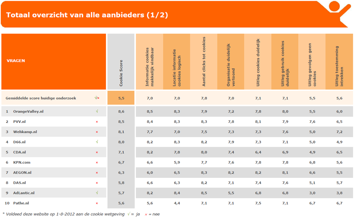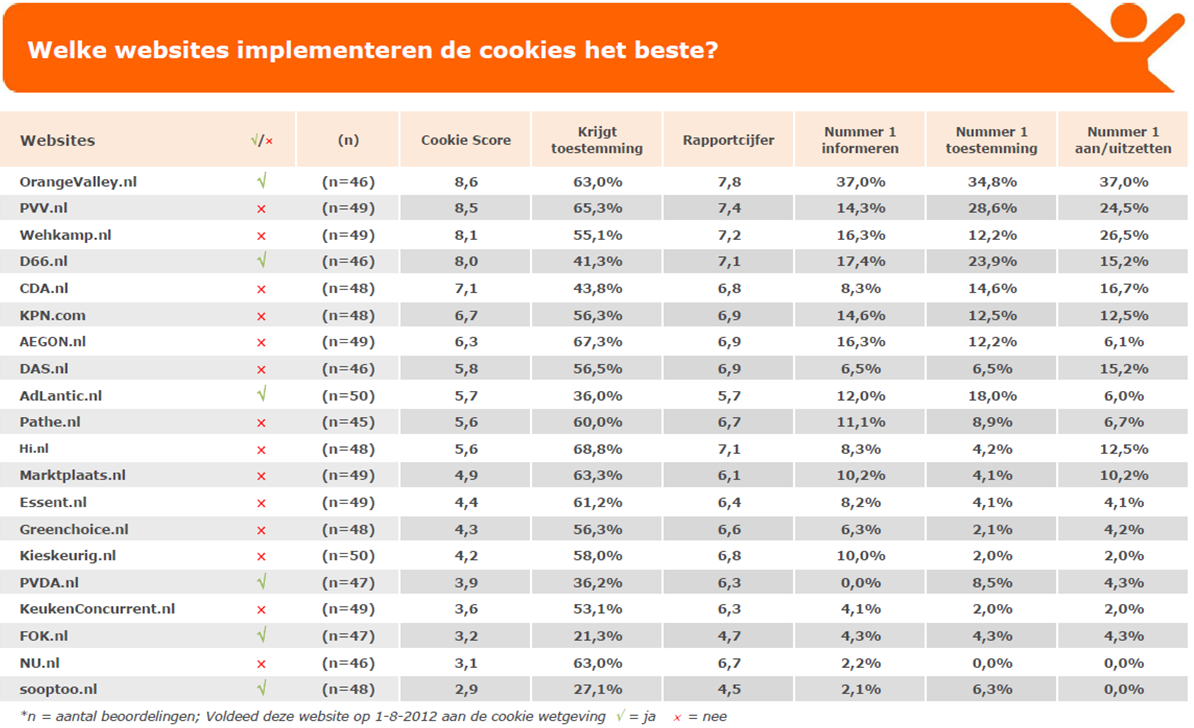 Beste Klaas, Dank voor de waardering voor ons werk vanuit OrangeValley in jullie onderzoek. Met deze eerste plaats in het cookieonderzoek zijn we uiteraard heel tevreden. Maar we zijn er nog niet. Wat ons betreft zou de wijze waarop wij dat nu aanpakken ook besproken mogen worden in je artikel. Dat zou voor veel lezers best interessant zijn. en… wij staan ook open voor jullie feedback. We gaan binnenkort weer verder om door middel van conversieoptimalisatie en multivariatietesten de cookieboodschap te verbeteren en dan willen we de aanbevelingen wel eens meenemen.