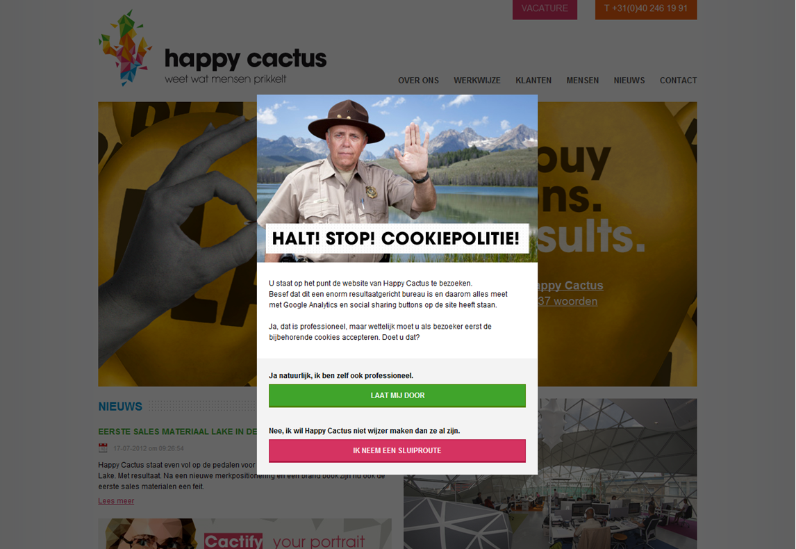 Een ander voorbeeld over informeren en toestemming vragen over cookies dat nog niet door ICTRecht is beoordeeld, maar dat te leuk is om niet te laten zien zag ik zojuist via Twitter op de site van HappyCactus. Doe er je voordeel mee!