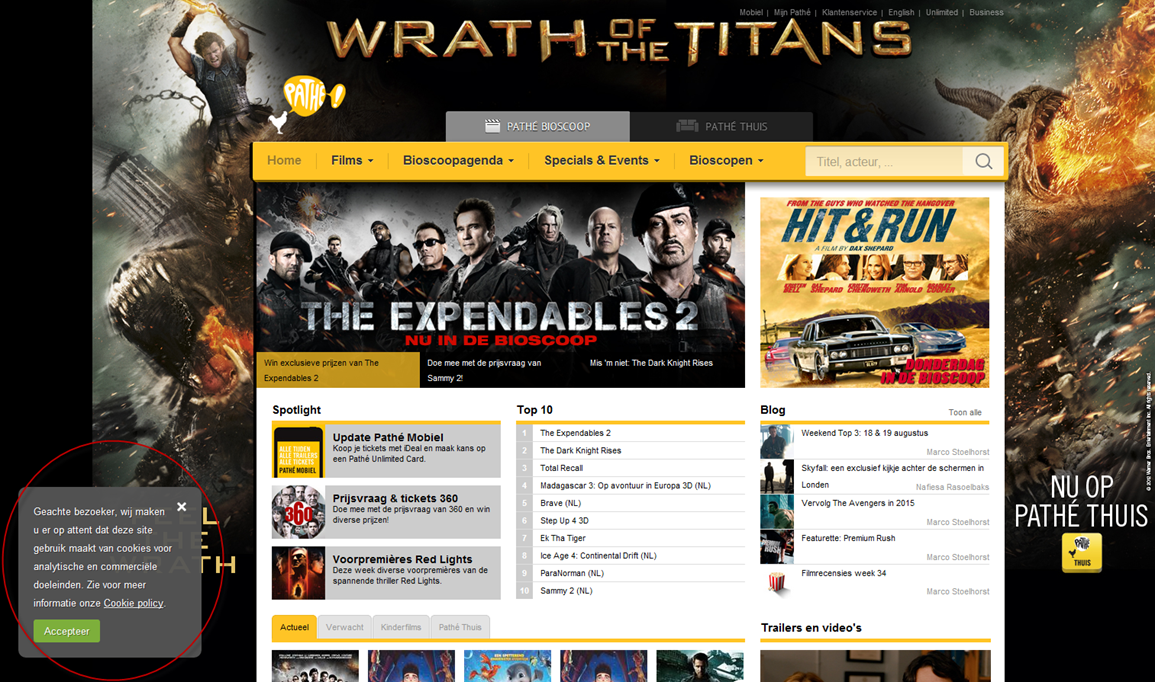 Een ander voorbeeld vinden we op de website van Pathé. Daar krijg je een kader links halverwege je scherm, met alleen een knop om te accepteren of weg te klikken. Het is daarbij onduidelijk of je door weg te klikken cookies accepteert of niet. Ook verdwijnt het kader na verloop van tijd. Dit wekt de indruk dat Pathé het cookie-issue een beetje probeert “weg te moffelen”: al met al wekt het weinig vertrouwen en juist vertrouwen is belangrijk om mensen cookies te laten accepteren.