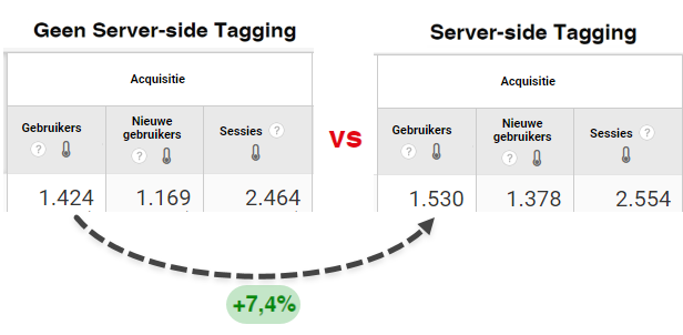 Er komt meer data binnen wanneer servers-side tagging is geïmplementeerd. Door recente wijzigingen ligt het percentage nieuwe gebruikers relatief hoger. Over de tijd heen zal dit gelijk gaan trekken.