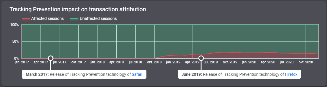Betekent dit dat we nu niet in actie zouden moeten komen? Het antwoord daarop is absoluut: NEE! Want allereerst is er momenteel al sprake van dataverlies door het blokkeren van third-party cookies in de browsers Safari en Firefox. Wij zien bij meerdere van onze opdrachtgevers dat 50 procent van het totaal aantal gebruikers Safari en Firefox gebruikt. Hierdoor is 50 procent van bezoekers- en conversiedata niet (goed) inzichtelijk. Dit heeft dus nu al een enorme impact op jouw marketingdata.