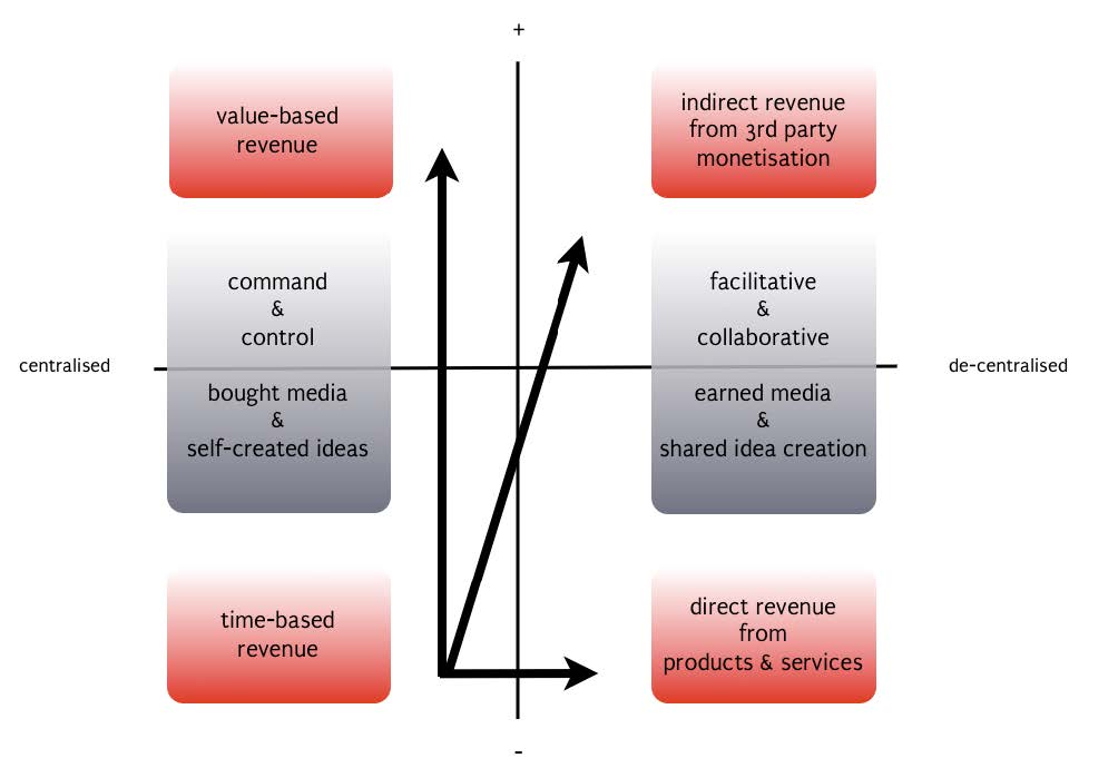 Bedrijven die ook over vijf jaar nog succesvol willen zijn moeten zich naar de rechterkant van bovenstaand model verplaatsen. Wanneer concurrenten bijvoorbeeld jouw software gebruiken om tegen jouw eigen producten te concurreren ben je op de goede weg. Iets wat partijen als Google, Microsoft en Amazon maar al te goed weten. Wat doet jouw bedrijf dat zo waardevol is dat je het tot een realiteit kan maken? Welke activitetien hebben niet meer, maar juist minder mensen nodig? Automatiseer de rechterkant van deze tabel en gebruik personeel enkel voor de linkerkant.