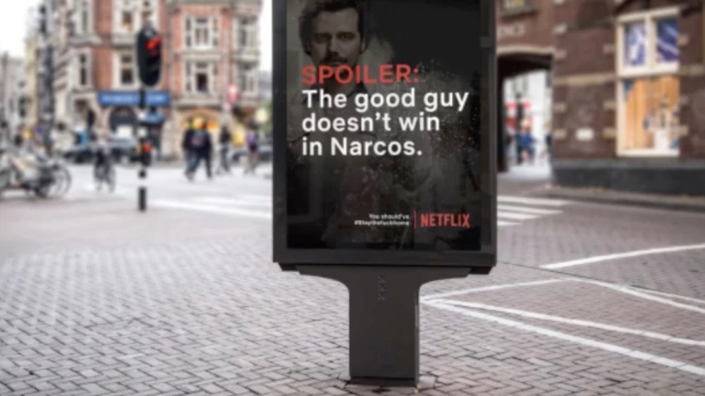 Briljant is de goed opgepikte inhaker van Netflix. In een denkbeeldige outdoor-campagne raadt de streamingdienst iedereen aan thuis te blijven tijdens de coronacrisis. Mét een extra dreiging: wie zich toch buiten waagt, kan zomaar tegen een billboard aanlopen met een keiharde spoiler. Zo verklapt Netflix hoe populaire series als Narcos, Stranger Things en Love Is Blind aflopen. Geniaal.