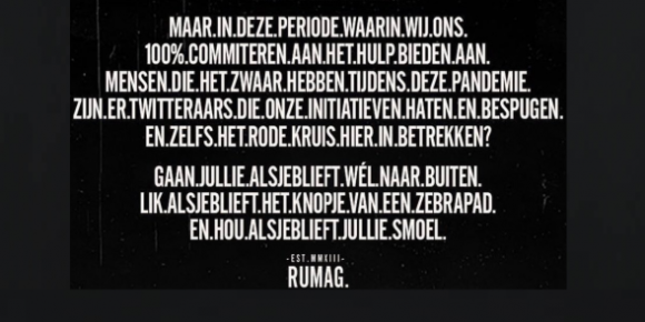 De grootste mispeer qua corona-inhaken komt natuurlijk op naam van jongerenmerk Rumag. Vanwege een misplaatste ‘corona-collectie’ ten gunste van het Rode Kruis (maar toch vooral ook de eigen portemonnee) werd het bedrijf aanvankelijk al flink afgefakkeld op social media, maar de kwestie bereikte werkelijk heel Nederland toen ook tv-programma Zondag Met Lubach het initiatief bij de enkels afzaagde. Een persverklaring na die venijnige uitzending van afgelopen zondag maakte het er allemaal niet beter op. Sinds deze week kent iedereen de hashtag #RuMagNietStelen. Fijn.Voor.Je.Merk.Toedeledokie.