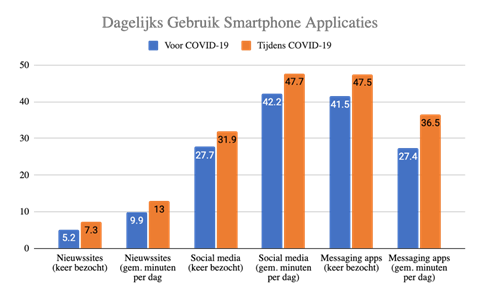 Dat covid-19 vooral impact had op onze menselijke behoefte om verbonden te blijven met anderen, blijkt uit de sterke toename in het gebruik van applicaties die sociale interactie mogelijk maken. Zowel de frequentie (+15 procent) als tijdsduur van social-media-apps steeg substantieel (+23 procent). Voor messaging apps, zoals WhatsApp, geldt er eveneens een sterke toename (respectievelijk 14 procent en 33 procent). Ook werd de smartphone tijdens covid-19 de belangrijkste bron van nieuwsupdates; het aantal bezoeken per dag steeg met 31 procent en de gemiddelde tijdsduur met zelfs 41 procent.
