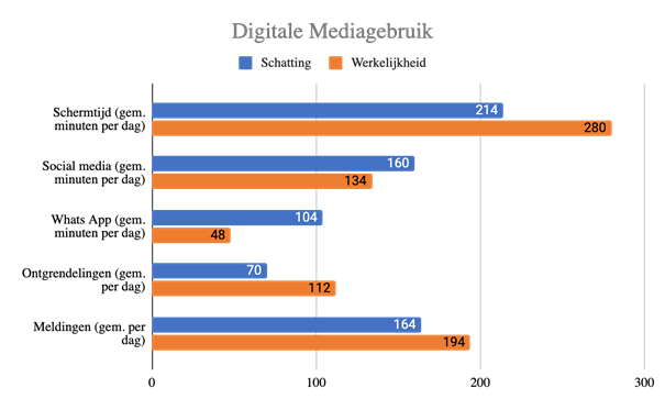 Studenten zeggen zich bewust te zijn van hun excessieve digitaal mediagebruik en zijn van mening dat ze ‘te veel’ gebruikmaken van hun telefoon, ondanks dat zij hun schermgebruik te laag inschatten.