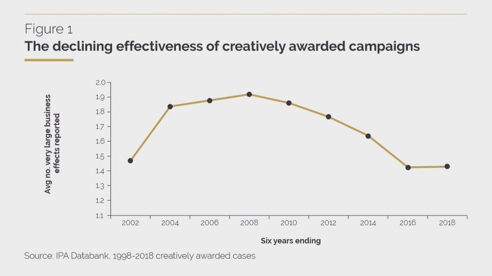 Ware het niet dat marketingadviseur en effectiviteitsonderzoeker Peter Field gebaseerd op recenter onderzoek toont dat ‘creatively awarded work is now no more effective than non-awarded campaigns’. Op basis van onderzoek laat Field zien dat creatief bekroonde campagnes 12 keer (!) zo efficiënt waren vergeleken met niet-onderscheiden campagnes. Nieuw onderzoek daarentegen wijst uit dat die multiplier is gezakt naar 4.