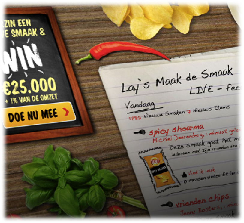 Een voorbeeld: de meest bekende crowdsourcingcampagne van Nederland is de ‘Maak de Smaak’-actie van Lay’s, waarbij heel Nederland werd gevraagd om een nieuwe chipssmaak in te zenden. Op Lays.nl kon je dit als participant doen door slechts je naam en e-mailadres achter te laten naast je (zonder twijfel winnende) smaak. Aan de zijkant van het scherm werden smaken van andere participanten ter inspiratie getoond, en alles zag er open en transparant uit, wat Lay’s sierde. Voor Lay’s leek het concurrentiegevaar groot, want wat belette een Pringles en Croky immers om zelf ook inspiratie op te doen voor een eigen nieuwe smaak?