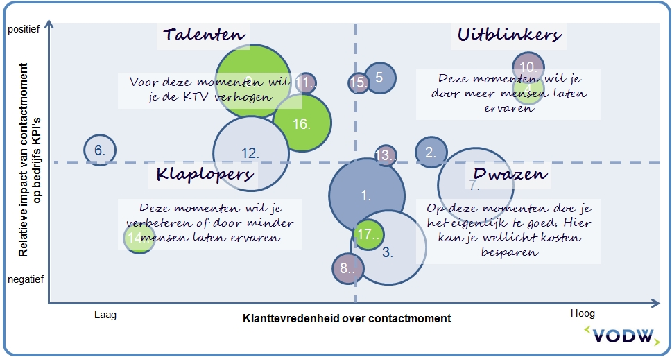 Tot slot zijn er de ‘dwazen’, momenten die individueel best aardig scoren, maar niet of zelfs negatief bijdragen aan de KPI’s. Vaak zijn deze heel onverwacht, zaken waarvan we op basis van kwalitatief onderzoek of transactionele metingen vaak verwachten dat deze momenten het verschil maken. Bij een gemeente zagen we bijvoorbeeld dat de doelstelling voor wachttijd aan de balie aanzienlijk scherper was dan op basis van klantpercepties nodig was. Door de beoogde wachttijd iets soepeler te hanteren, bespaart de gemeente aanzienlijk.