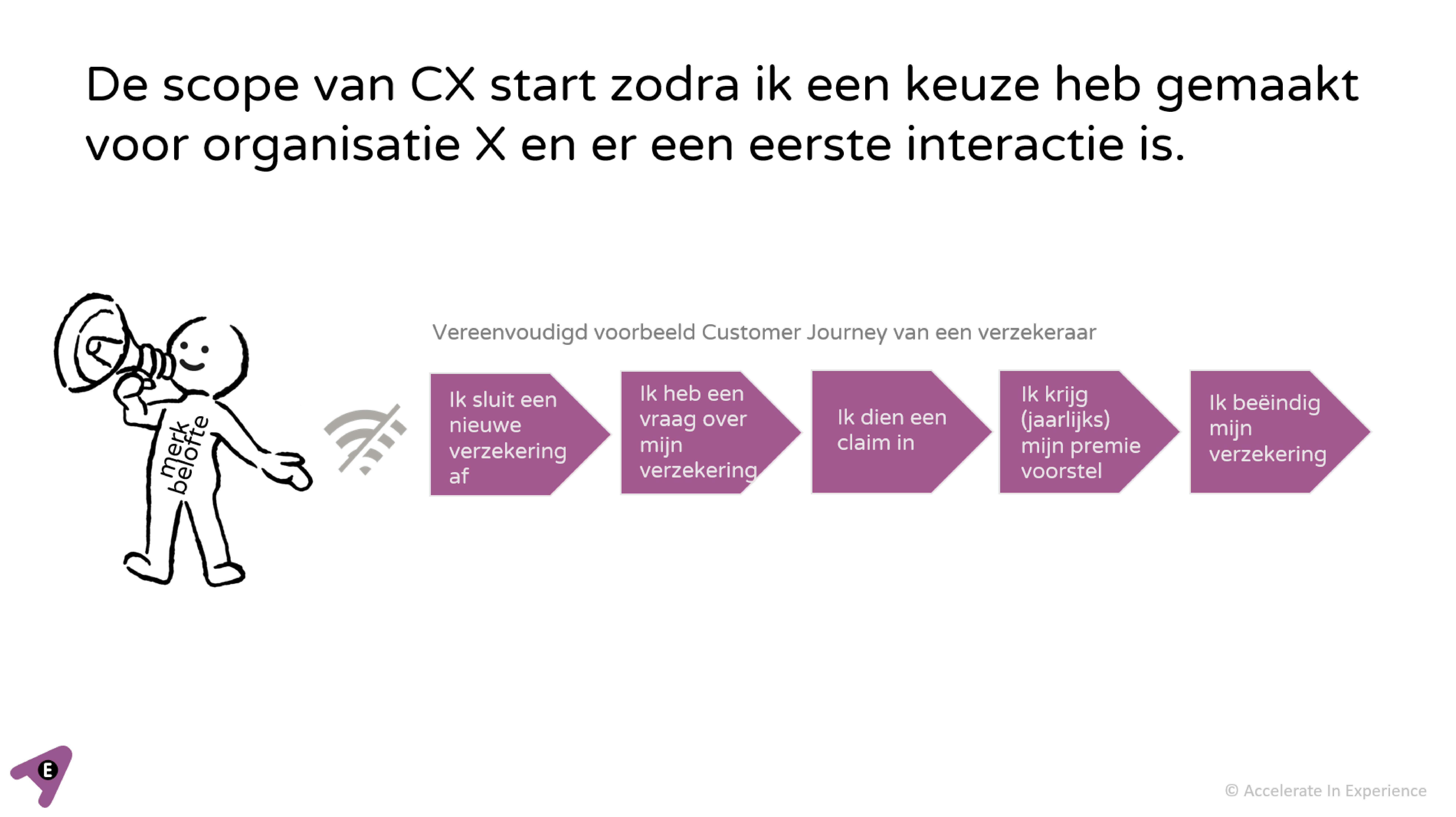 De scope van customer experience loopt vanaf het moment dat ik besloten heb: ik ga naar OHRA of; ik ga naar Centraal Beheer. Hoe ik tot die keuze kom, dat is brand experience. Het merk moet ervoor zorgen dat in dit voorbeeld Centraal Beheer bij mij top of mind is op het moment dat ik aan een verzekeraar denk. CX begint dus vanaf het moment dat ik dat besluit heb genomen en ik ga googlen op Centraal Beheer of ik ga naar de website van Centraal Beheer, tot en met het moment dat ik afscheid neem van de organisatie en al mijn journeys daartussen.
