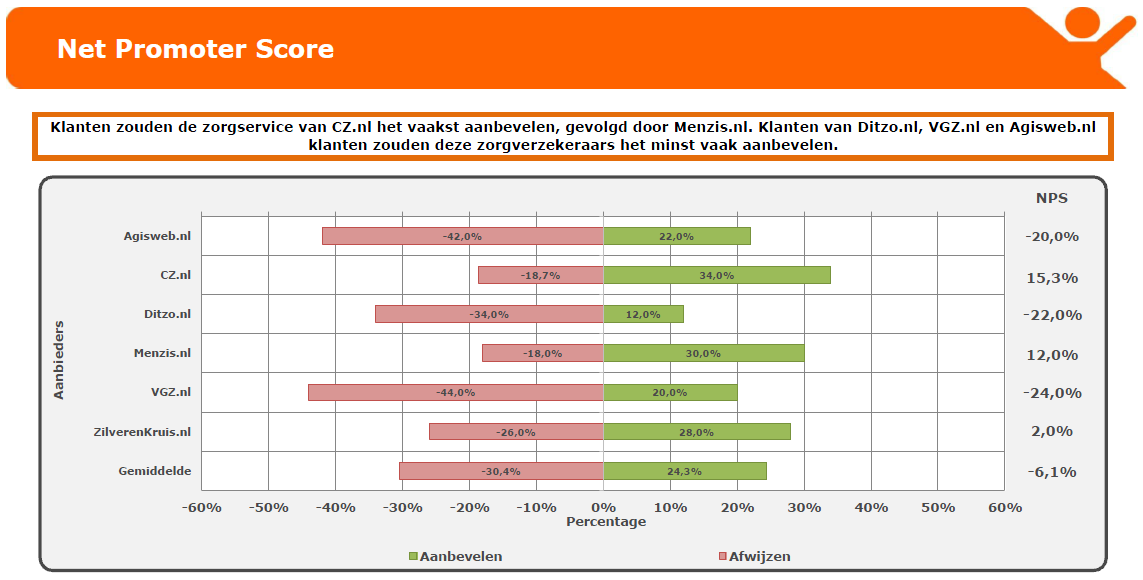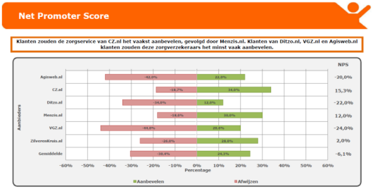 Door respondenten te vragen of ze een organisatie zouden aanraden aan anderen, kan de Net Promoter Score van die organisatie in kaart worden gebracht. CZ behaalt hier de meest positieve score, gevolgd door Menzis. ‘Ik zou het zeker aanraden omdat er veel gegevens terug te vinden zijn over de polis en makkelijk wijzigingen doorgegeven kunnen worden, en alle post die binnenkomt staat ook nog eens digitaal opgeslagen zodat je het altijd terug kan kijken’, luidt de toelichting van een respondent. VGZ, Ditzo en Agis worden het minst vaak aanbevolen.