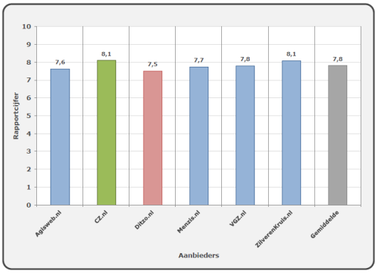 Zoals blijkt uit onderstaand overzicht, liggen de rapportcijfers van de verzekeraars vrij dicht bij elkaar. Allen scoren zij een ruime voldoende. Op deelaspect- en caseniveau zijn echter significante contrasten te ontdekken, die het verschil in eindscore verklaren tussen CZ en Zilveren Kruis aan de hogere kant, en Ditzo en Agis aan de lagere kant.