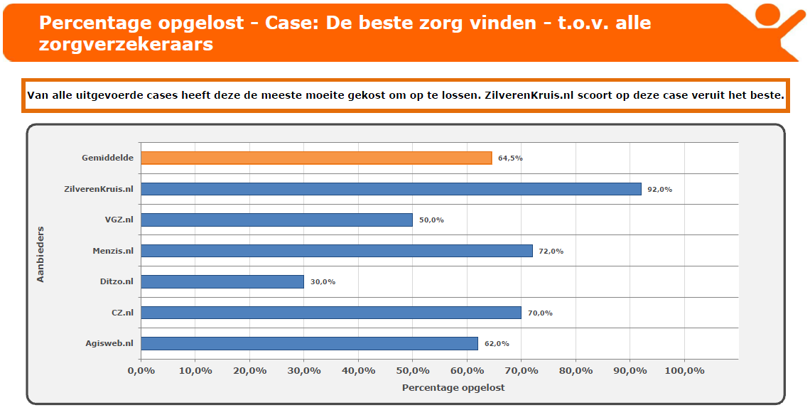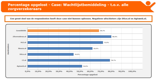 Een uitvergroot beeld van de eindranglijst zien we wanneer respondenten op zoek gaan naar informatie over wachtlijstbemiddeling. Bij Zilveren Kruis en CZ weet viervijfde van de bezoekers de case naar behoren op te lossen. Ditzo (44%) staat opnieuw onderaan, met Agis (52%) niet ver daarboven. ‘Ik weet nog niet voldoende’, geeft een bezoeker van Agisweb.nl aan om het vervolgens na enkele pogingen op te geven.