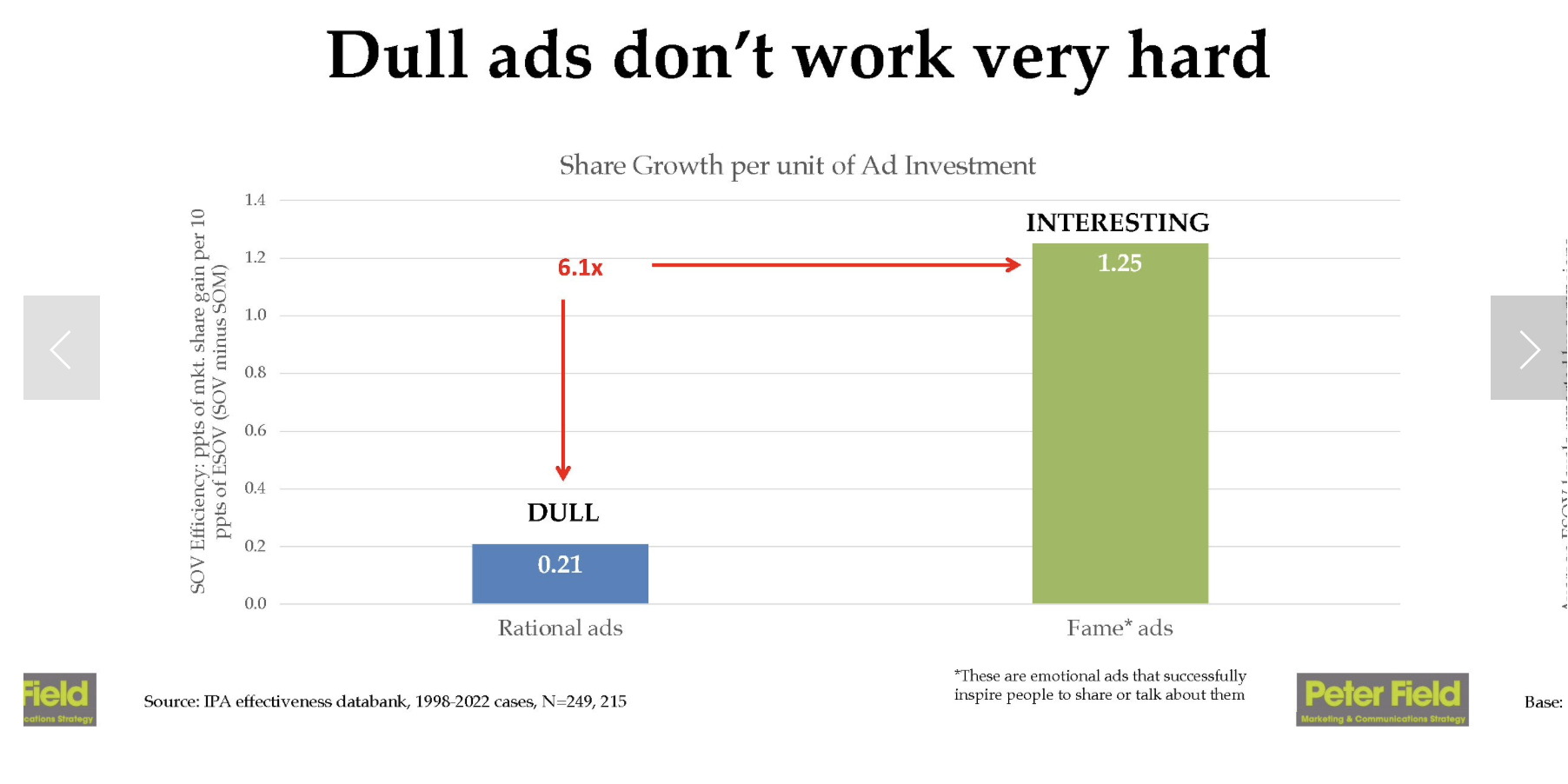Wat een mooi inzicht. We proberen allemaal inzicht te krijgen in de effectiviteit van onze communicatie-inspanningen. De toegang tot data maakt het steeds eenvoudiger om de juiste persoon, op de juiste plaats, op het juiste tijdstip, op het juiste device met de beste boodschap te bereiken. En aan de hand van de resultaten plannen we weer vrolijk verder. Maar dat laatste stukje? Die boodschap. Hoe zit het daar eigenlijk mee? Peter Field heeft onderzoek gedaan naar iets wat veel te vaak wordt vergeten maar wellicht door iedereen wordt opgemerkt. De onwaarschijnlijke saaiheid van veel merkcommunicatie. Ja, je leest het goed. Saaiheid! En wees eerlijk, dit herkennen we allemaal. Hij framed dit als: ‘Advertising has been getting increasingly dull thanks to the impact of 15+ years of performance marketing’. En Peter Field zou Peter Field niet zijn als hij deze stelling onderbouwt met onderzoek. Onderzoek dat aangeeft wat de extra kosten van een ‘saaie’ campagne zijn. In relatie tot dit onderwerp is er een mooi project, reeds gestart in 1999 door Adam Morgen met de naam “The Challenger Project” Hier kan je o.a. een podcast vinden van Adam samen met Peter Field. Uiteraard over het onderwerp ‘the cost of dull in business’.