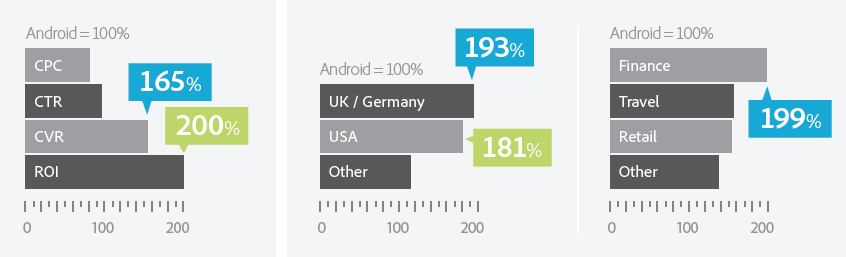 De CPCs, ROI en conversieratio's lopen enorm uiteen als het aankomt op mobiel. Wanneer je bijvoorbeeld onderscheid maakt tussen mobiele besturingssystemen zien we dat conversieratio's van iOS bijna twee keer (93%) zo hoog zijn als die van Android. In combinatie met de 18% lagere CPC zorgt voor een tweemaal zo hoge ROI van iOS zoekverkeer
