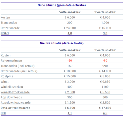 Als in het voorbeeld rekening wordt gehouden met retourneringen, kostprijs, winkelbezoeken en app-downloads, dan heeft de zoekterm ‘zwarte sokken’ een veel hogere waarde. Deze nieuwe waarde kan vervolgens worden gebruikt voor het inrichten van de nieuwe biedstrategie waarin automatisch meer wordt geboden voor deze specifieke zoekterm en het budget verschuift naar zoekwoorden die de meeste winst genereren.