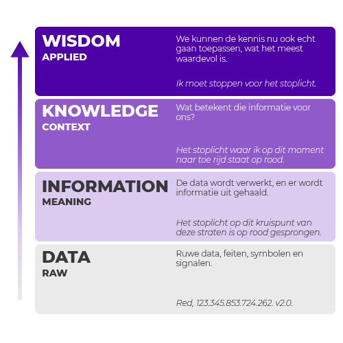 Naast de ontwikkeling van datagedreven marketing, is het ook belangrijk om een definitie te hebben van data. Een manier om dit te verduidelijken is de zogenaamde DIKW of datapiramide. Deze 4-laags piramide is opgebouwd met data als basis. Dan volgen informatie, kennis en wijsheid. Kortom, hoe hoger in de piramide, hoe meer waarde. Om die stappen uit te leggen is het handig om het voorbeeld van een rood stoplicht te gebruiken. Op datagebied is er de ruwe data: ‘rood’ en kennen we de coördinaten die vertellen wáár het stoplicht zich bevindt. Vervolgens gaan we er betekenis aan toevoegen en wordt het informatie: ‘het gaat over het stoplicht op de hoek van de kerkstraat en de dorpsstraat en dat stoplicht staat op rood’. Vervolgens ga je er context aan toevoegen, waardoor het kennis wordt: ‘Dat is het stoplicht waar ik nu op aan het afrijden ben’. Tenslotte ga je die informatie toepassen, waardoor het wijsheid wordt: ‘Het stoplicht staat op rood waardoor ik moet stoppen!’