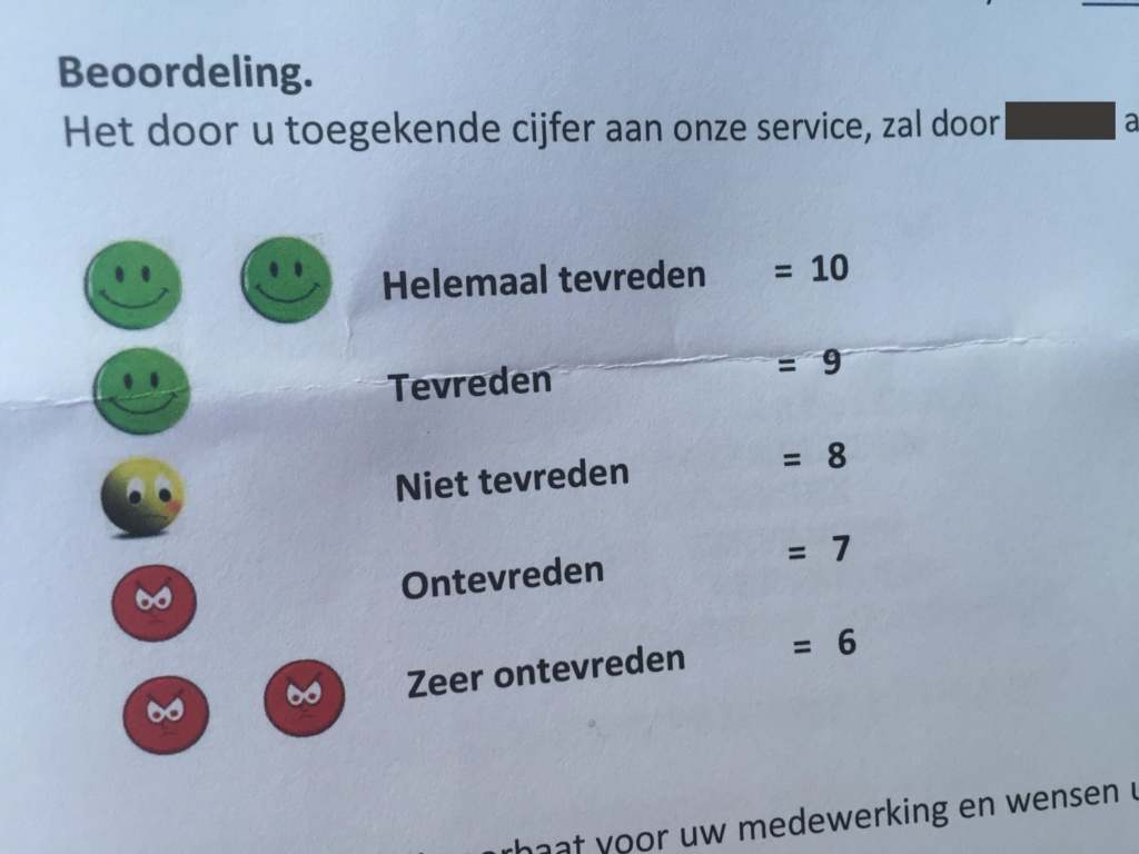 Voorkom ook priming in de schaalverdeling van de metric die wordt uitgevraagd. Een treffend voorbeeld van hoe het niet moet, is onderstaande schaalverdeling van een autodealer, waarbij klanten worden gedwongen een 9 te geven wanneer zij (enigszins) tevreden zijn over de dienstverlening.