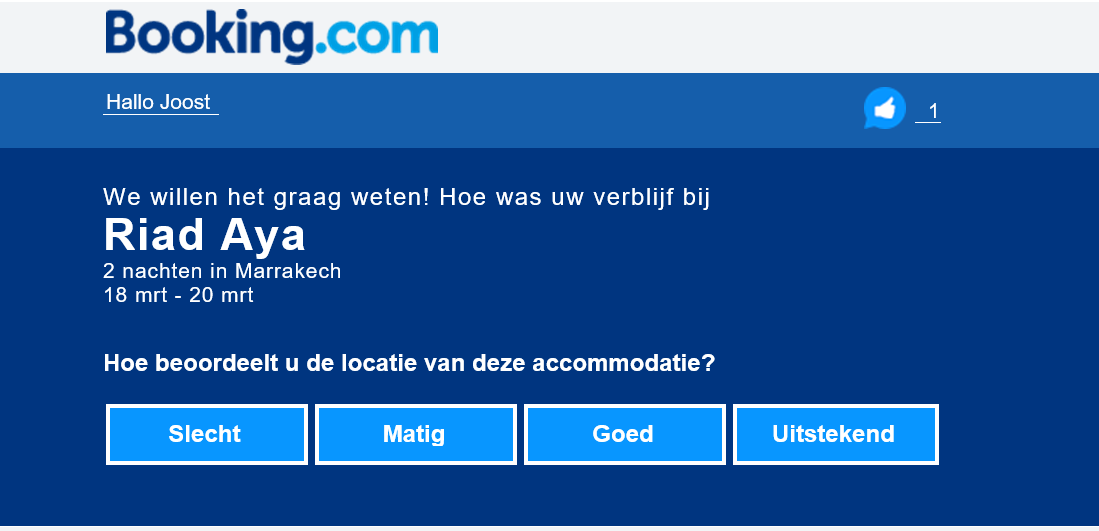 Voorbeeld tevredenheidsbeoordeling direct in de e-mail (Booking.com)