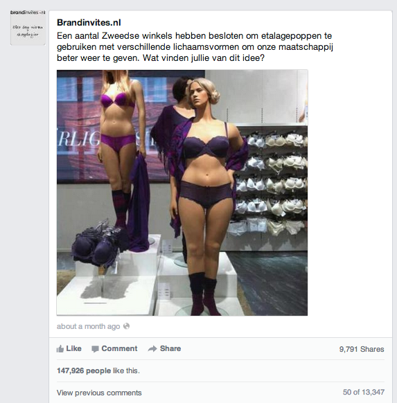 Etalagepoppen met ‘normale’ lichaamsvormen worden massaal gewaardeerd getuige het bericht van Brandinvites.nl. En dat is opmerkelijk te noemen, want de pagina van Brandinvites.nl (een exclusieve online fashion-outlet voor vrouwen) heeft ‘maar’ 3.800 fans en deze update genereerde met dit bericht bijna 150.000 (!) likes, ruim 13.000 reacties en is bijna 10.000 keer gedeeld.