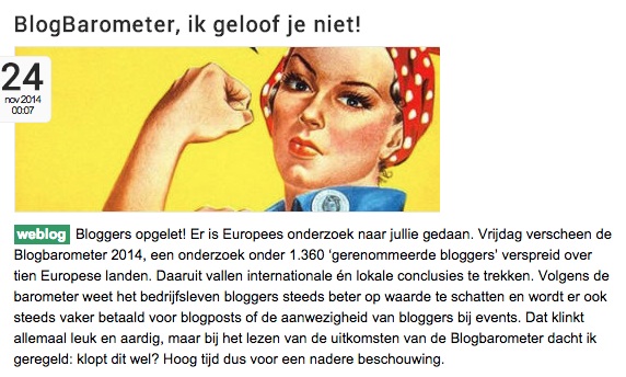 Toen besloot ik al er een dag later een commentaar op te schrijven, waarin ik alle cijfermatige bevindingen een voor een onder het vergrootglas legde. Wat mij opvalt, is dat journalisten zelden nog op die manier aan de slag gaan met de persberichten die ze binnenkrijgen. Een gouden kans natuurlijk voor PR-bureaus en spindoctors, maar ik probeer met enige regelmaat te laten zien dat het ook anders kan. Die scherpere blik wordt gewaardeerd, want mijn analyse van de BlogBarometer 2014 is heel goed gelezen.