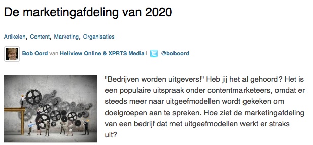 “Gezien de veranderingen die organisaties moeten maken om hun marketingexecutie succesvol aan te laten sluiten op contentmarketingambities, begrijp ik wel dat het is aangeslagen”, aldus Bob Oord. “Dit onderdeel van contentmarketing krijgt ook wat minder aandacht, dus het artikel voegt iets toe aan bestaande blogs, En de titel bekt natuurlijk lekker.” Of hij ook kritiek heeft gekregen? “Ja, de rol van medewerkers als socialmedia-aanjagers, ofwel ‘employed media‘, heeft geen aandacht gekregen. Dat had inderdaad nog aangestipt kunnen worden.”