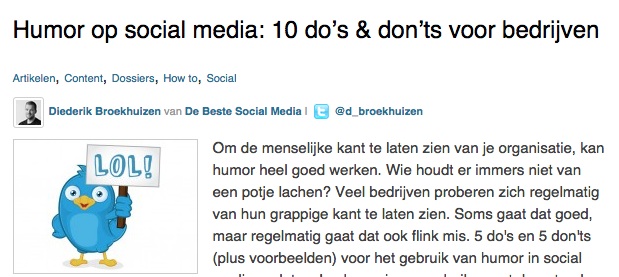 Verantwoordelijk voor de tien tips is Diederik Broekhuizen, die we dit jaar vooral hebben leren kennen via De Beste Social Media. Deze blog is regelmatig (één van) de eerste die een meme oppikt en er over schrijft, zoals recent nog deze Twitter-inhaker van Jordi van de Bovenkamp.