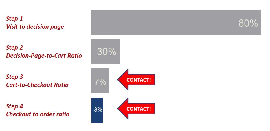 Proactieve chat ondervangt 25 procent tot 30 procent van de klanten die voortijdig afhaakt tijdens het aankoopproces. Het blijkt echter dat deze klanten wel degelijk te helpen zijn, mits je ze op het juiste moment op een eenvoudige manier hulp aanbiedt. Dat doe je bijvoorbeeld door prominent een chat button op deze pagina’s te plaatsen. Nog beter is het inzetten van pro-actieve chat, exact op momenten dat klanten in de problemen zitten. Zie de pijlen in de online funnel hieronder.
