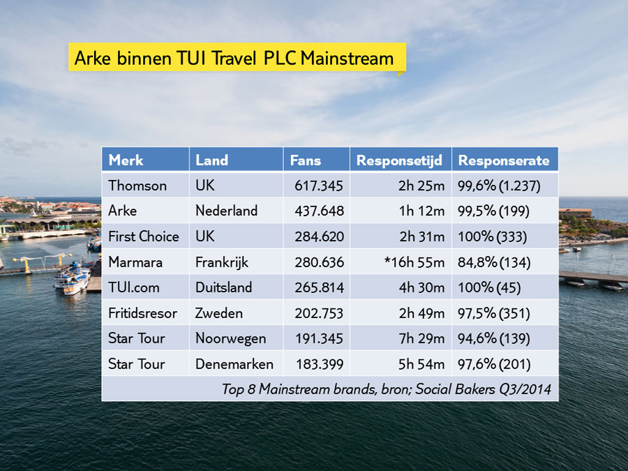Binnen de TUI Travel PLC Mainstream is Arke een van de voorlopers op het gebied van social media. Dat komt ook tot uiting in social care en dan voornamelijk in de snelheid waarmee we reageren. Een aantal landen hebben nog geen 24/7 bezetting en leveren vooral buiten kantoortijden in op snelheid. De groepsstrategie is om in alle landen hetzelfde, hoge serviceniveau na te streven.