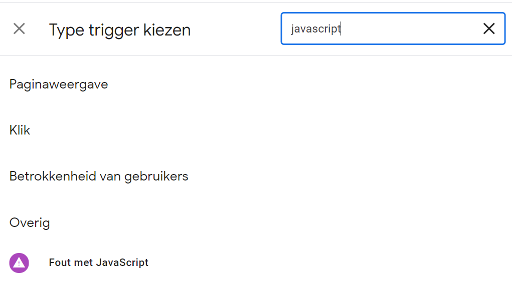 Maak vervolgens een nieuwe trigger aan. Zorg je bij type trigger voor ‘fout met Javascript’ kiest en laat de overige instellingen zoals ze zijn.